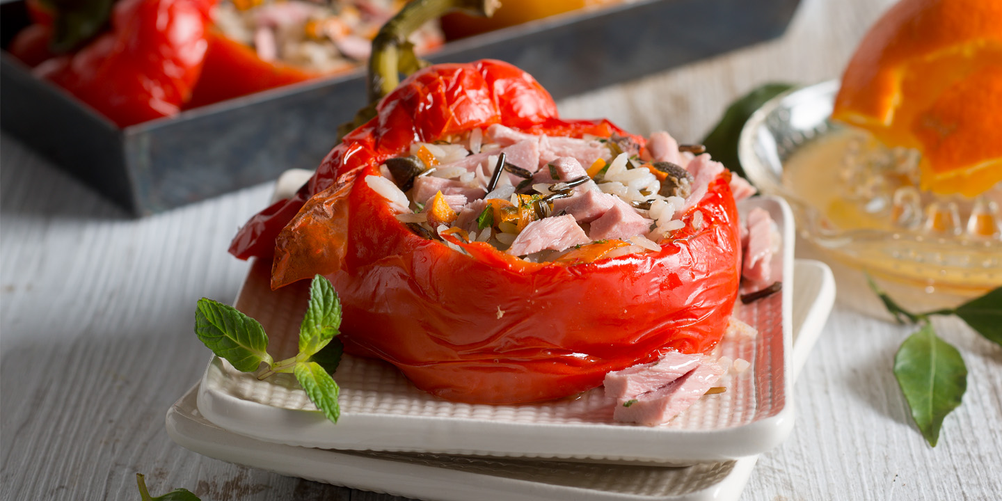 HomeRezepteGefüllte Paprika mit Thunfisch und Reis