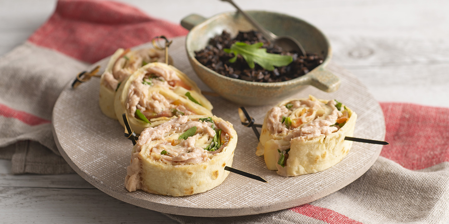 1. Die Tortillaschreiben dünn mit Rio Mare Paté bestreichen, die in dünne Scheiben geschnittene Tomate und die Käsescheiben darauf legen. Anschließend kleingehackte Oliven darauf verteilen.