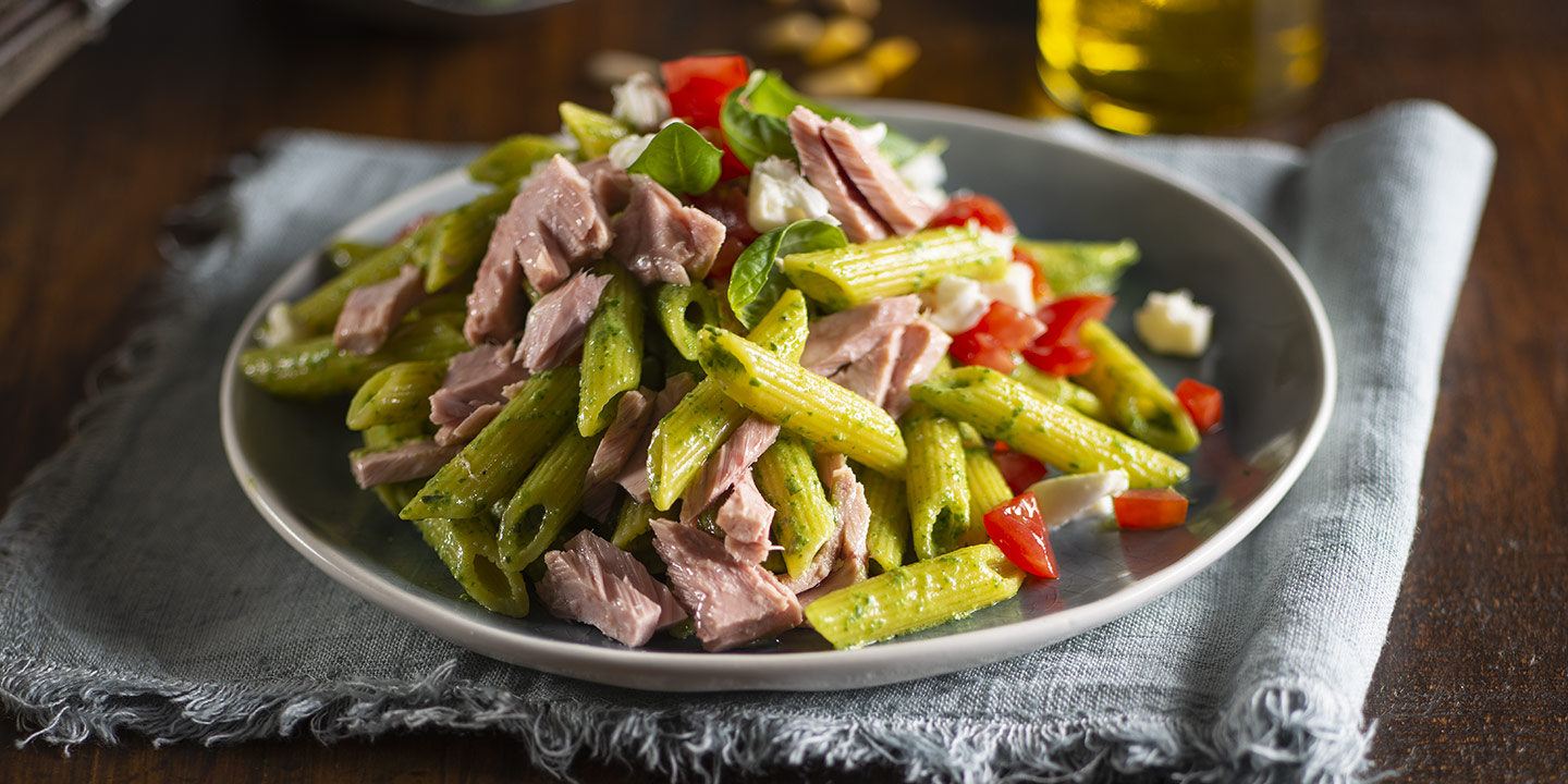HomeRezeptePasta mit Basilikum-Frischkäse-Pesto, Thunfisch und Mozzarella