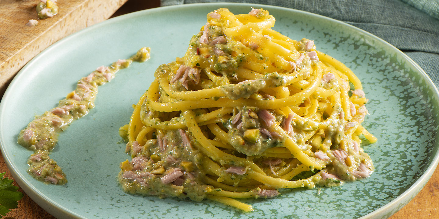 HomeRezeptePasta mit Thunfisch-Pesto, Pistazien und Zitrone