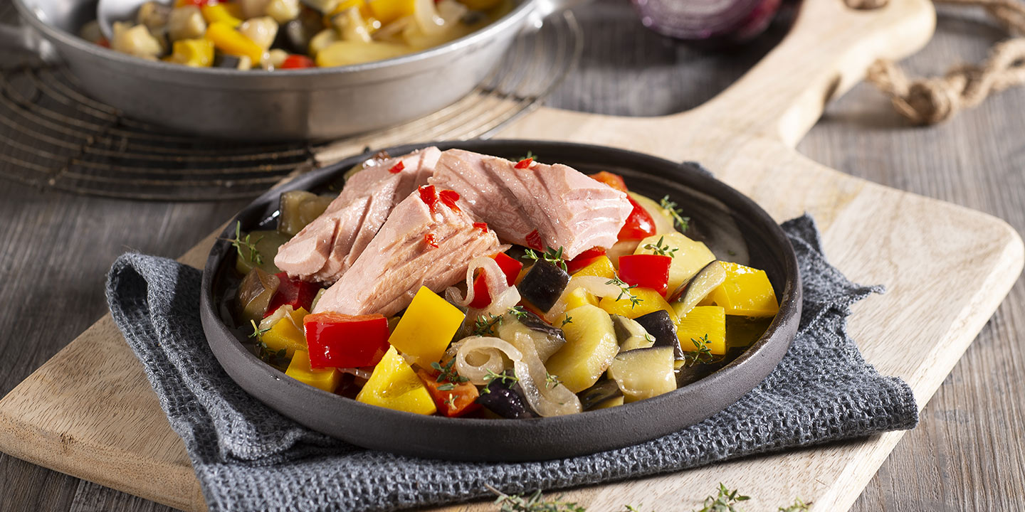Thunfisch* 37%, Tomaten 28%, Olivenöl 17%, schwarze Oliven 6%, natives Olivenöl extra 6%, Kapern 3%, Salz, Gewürze, Oregano 0,1%, Chili 0,05%.