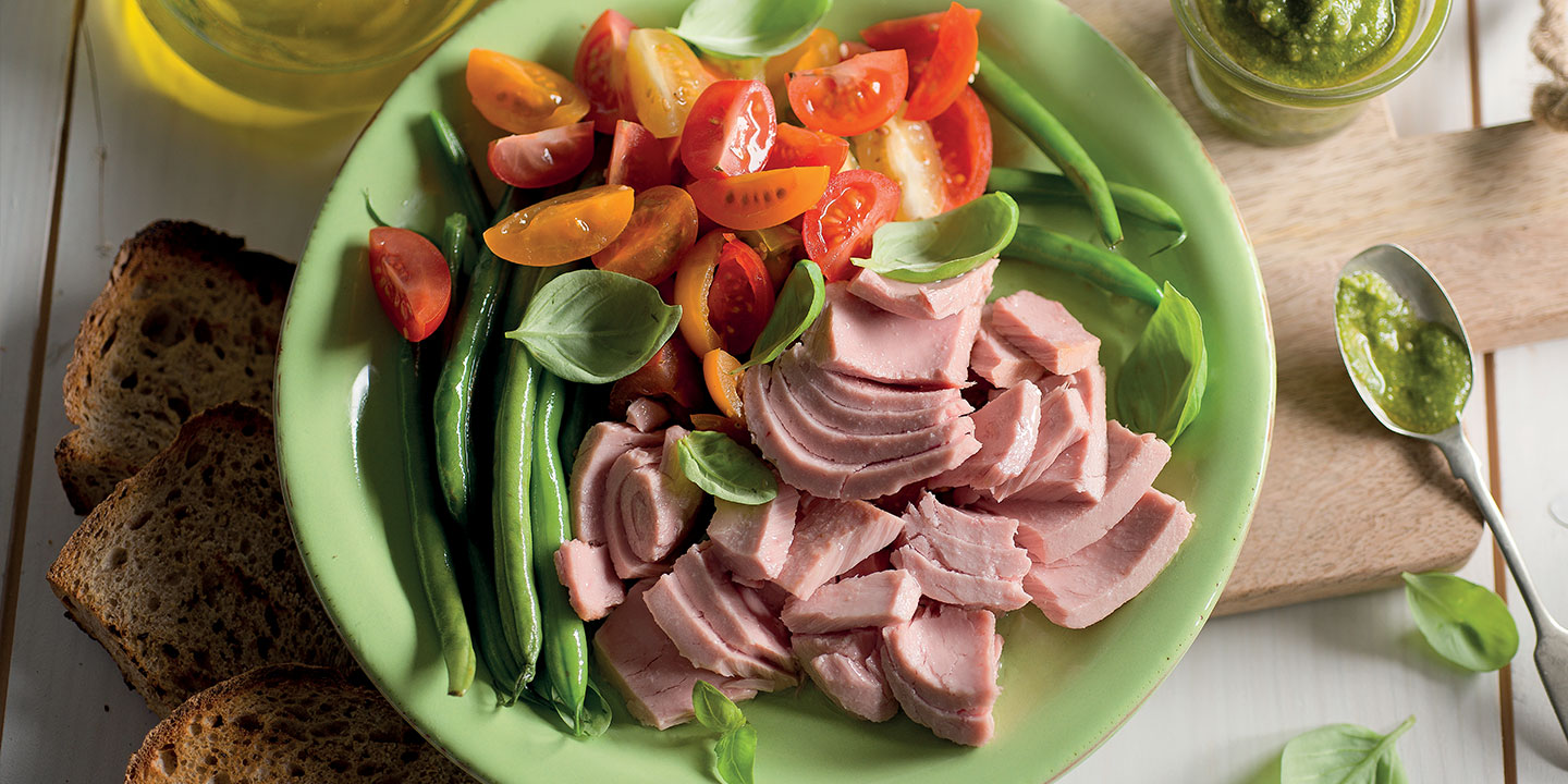 HomeRezepteThunfisch mit Tomaten, Fisolen und Basilikum