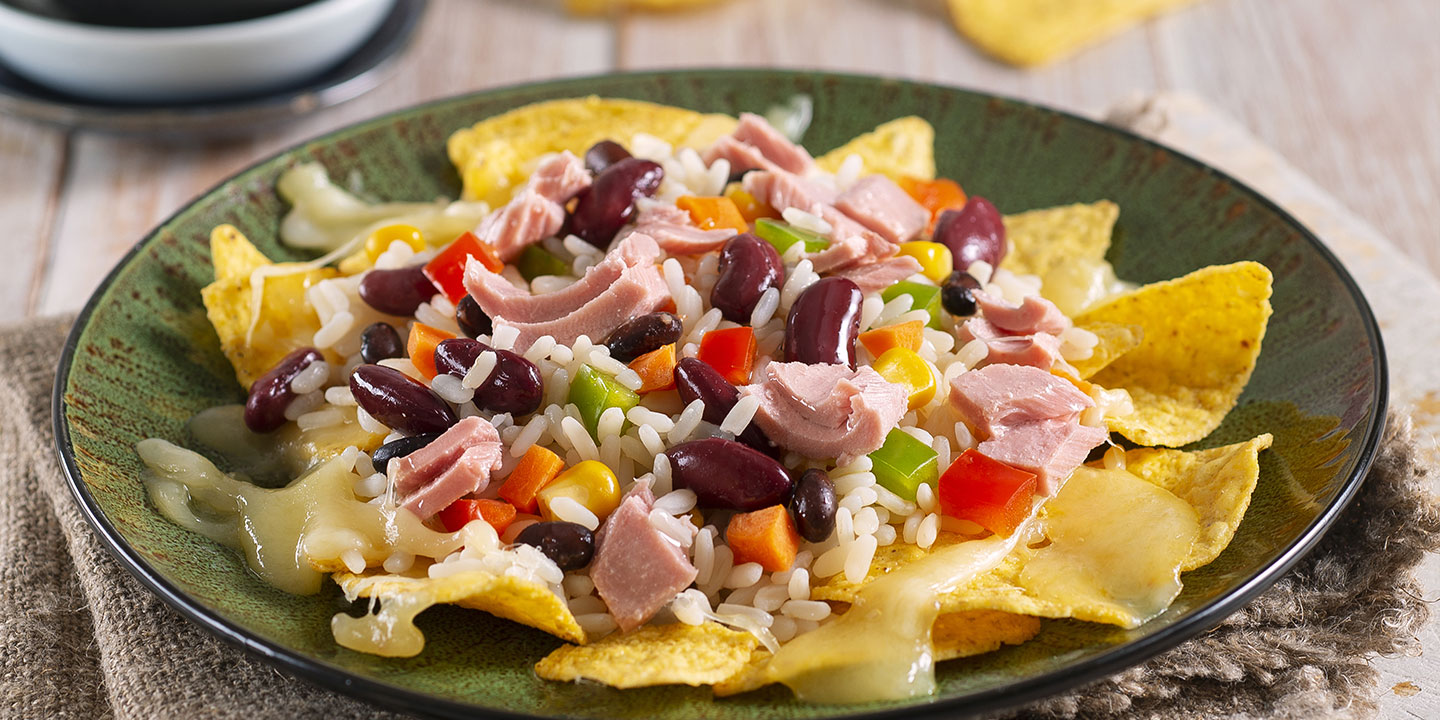 HomeRezepteThunfischsalat auf Tortilla Chips und geschmolzenem Käse